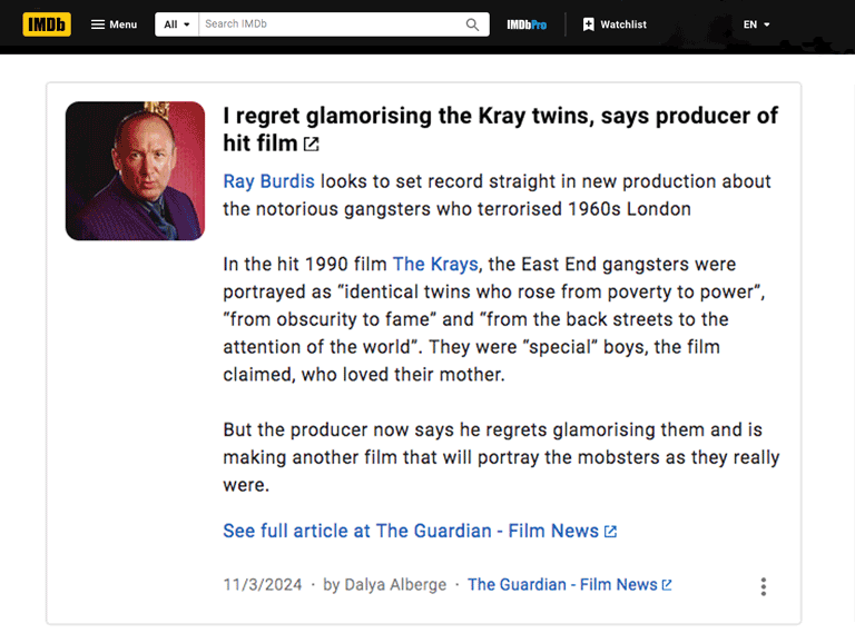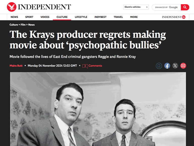 The Krays producer regrets making movie about ‘psychopathic bullies’